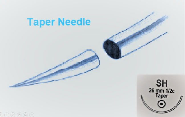 This is where the needle is round in cross-section. It is only sharp at the point. This means it parts the tissue as it goes through rather than cutting it. It is usually used when suturing deeper structures and when controlling bleeding. It is also useful for suturing mucosa such as the inside of the lips or for a circumcision.